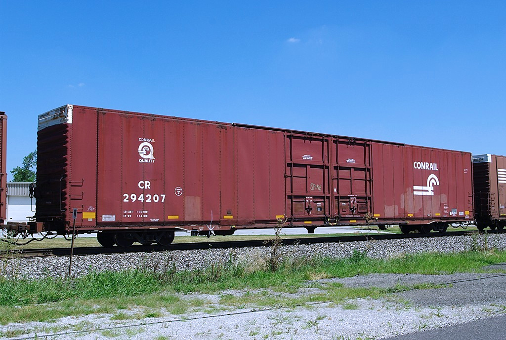 The class X60S 86' double-door boxcars were built in 1965 by Greenville Steel for New York Central as Lot 962B. They had series NYC 67126-67280. In 1976, 72 cars on the Conrail roster still had their NYC numbering and paint scheme. These would be placed into series CR 293090-293203 series and be renumbered as time permitted. Before 1976, 80 cars had been renumbered in series PC 293126-293280 and became CR 293126-293280. It gets confusing because the X60S cars still in NYC markings in 1976 were renumbered around the cars that got renumbered as Penn Central and then Conrail. Finally, some X60S cars were renumbered later across the CR 242700 series. Yipes! CR 294207 was renumbered from NYC 67196, to CR 243418 before being numbered CR 294207.