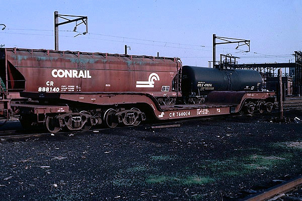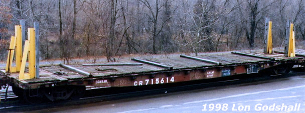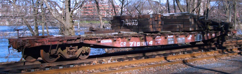 In late-1956, the Pennsylvania Railroad built 700 class F41 flatcars, placing them in series PRR 469300-469999. These were 53' GSC Commonwealth flatcars with a cast steel frame, wooden deck, and 535 sq ft platform area. As can be seen in this photo, the wooden deck got abused over the years since this car probably served in maintenance of way trains. The F41 flatcars went to Penn Central and eventually Conrail. They were in series CR 715530-716338, which included the occasional F41B and F41F classes scattered throughout it, even those cars were also in their own series. Cars from the F41A and F41D subclasses don't seem to be mixed into this series. Tracking old Conrail flatcar classes is complicated and confusing!