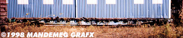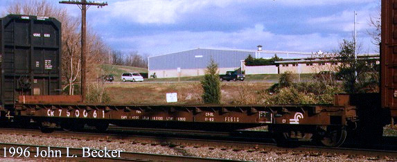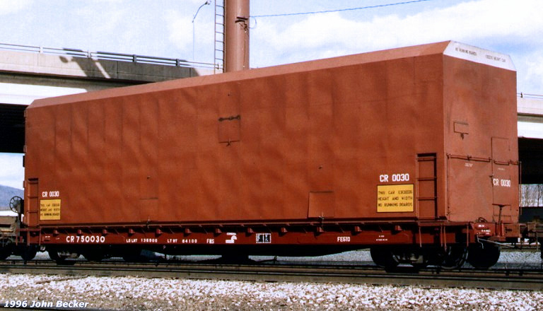 In mid-1969, Erie Lackawanna had Magor build 100 51' steel-frame flatcars with low deck-end bulkheads. Originally, they were in series EL 8200-8299. These became Conrail class FE51D flatcars. CR 750030 was part of FE51D series CR 750020-750068. CR 750030 is seen here with CR 0030, a container designed for transporting aerospace parts.