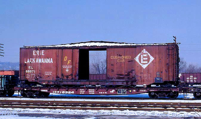 CR 716324 class F41B carries a wrecked Erie Lackawanna boxcar #68671 on what is probably its last ride.