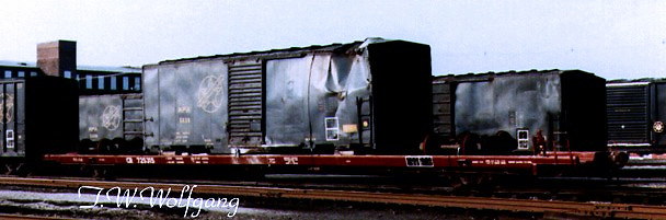 CR 725315 is an 89' flatcar loaded with a wrecked MPA 40' boxcar.