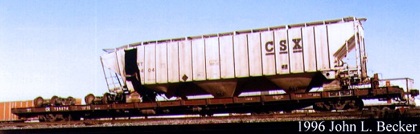 CR 725574 is a former MDTX 89' flatcar that was in series CR 725574-725578 with other former MDTX 89' flatcars. This one is carrying a damaged CSX covered hopper.
