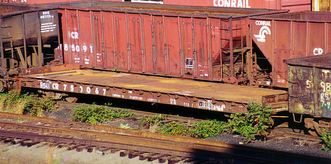 If you look closely through the weeds, you can see this former Penn Central F41 class flatcar with slanted CR stencils, which were used during the early days of Conrail. (The problem with photographing flatcars from the side is that they are just so...flat.)