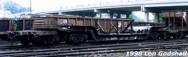 CR 766014 is a 66' depressed-center flatcar with a 25' steel loading floor. It could carry a load up to 350,000lbs that extended up to 10' beyond the center of the car.