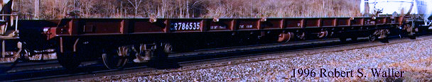 CR 786533 is an 89' channel-side flatcar that was part of series CR 786500-786575. These were former MDAX cars in Conrail F126 for general service or class M150 when placed into maintenance of way service. The MoW cars were painted light gray, of course.
