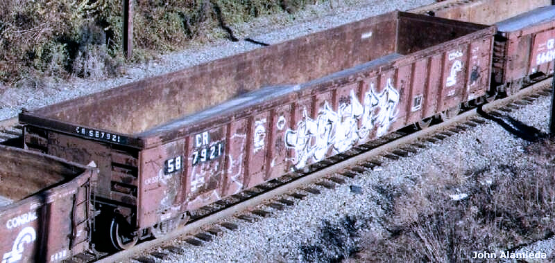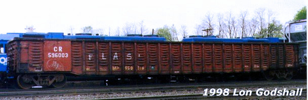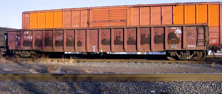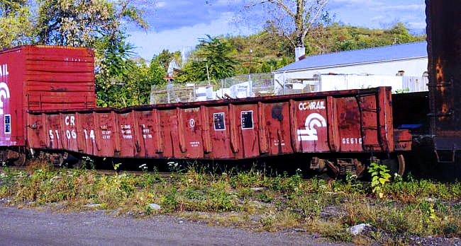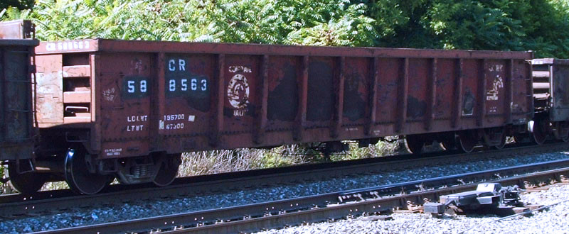 In the 1990's, Conrail purchased a large group of former Missouri Pacific gondola and quickly painted over the MoPac heralds and numbers, applying CR reporting marks. This is former MP 650118; the original reporting marks can be seen on the side of the car.