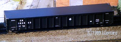 Contrary to popular belief, Conrail did not paint these gondolas blue. Instead, Conrail purchased these cars from the Cape Breton and Central Nova Scotia Railway (CBNS) and restenciled them 'CR.' The former CB&CNS markings are quite evident under the paint-out area. Sometimes the cars had a sticker on the side that read "Provided by a Railtex Feeder Railroad," while other cars had this sticker removed. No class markings on any car, as per practice on new CR equipment purchased in 1998.