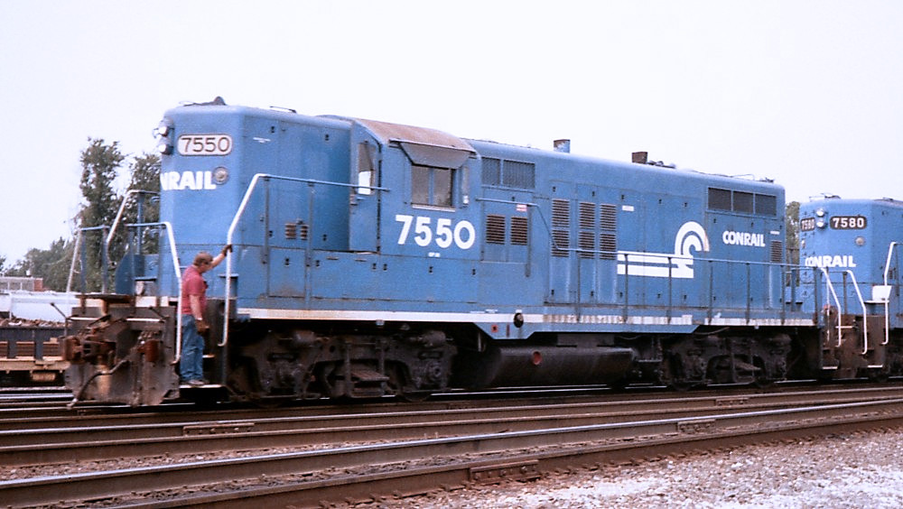 CR 7550 and CR 7580 (see below) are working Harrisburg Yard on a hazy summer day in 1994. I took this on my first real day of railfanning in 14 years. CR 7550 began as GP9 CR/PC/NYC 7443.