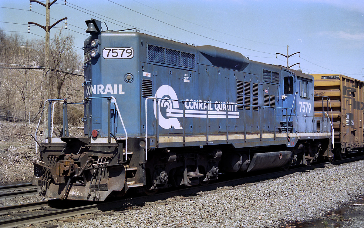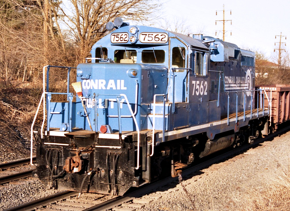 CR 7562 was rebuilt from GP9 PC 7098, which never had time to be renumbered into CR, going straight into the GP10 rebuild program. CR 7562, complete with obligatory broom, is working on local WPLE-33 (Way Freight / Philadelphia Division / Lebanon, PA) that day between Lebanon and Reading.