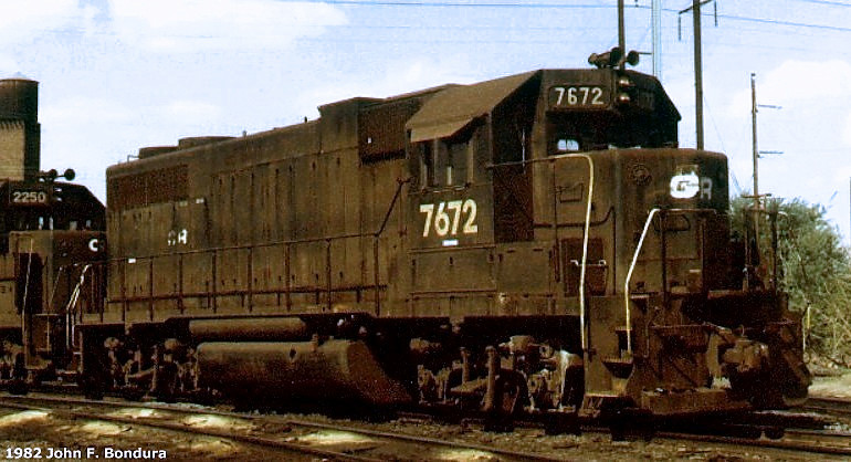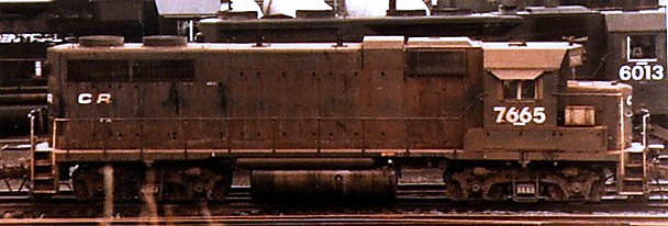 Here we see that CR 7635 has been repainted in since it was rebuilt from a GP35 in 1984. The number boards are now black numbers on a white background. A white safety stripe has also been applied along the side walkways, but oddly it does not run the entire length of the long hood and it should. A big thanks to The Model Railroad Club in Lenape Park, Union Township, New Jersey, for allowing me to re-post their photo for the past 20+ years.