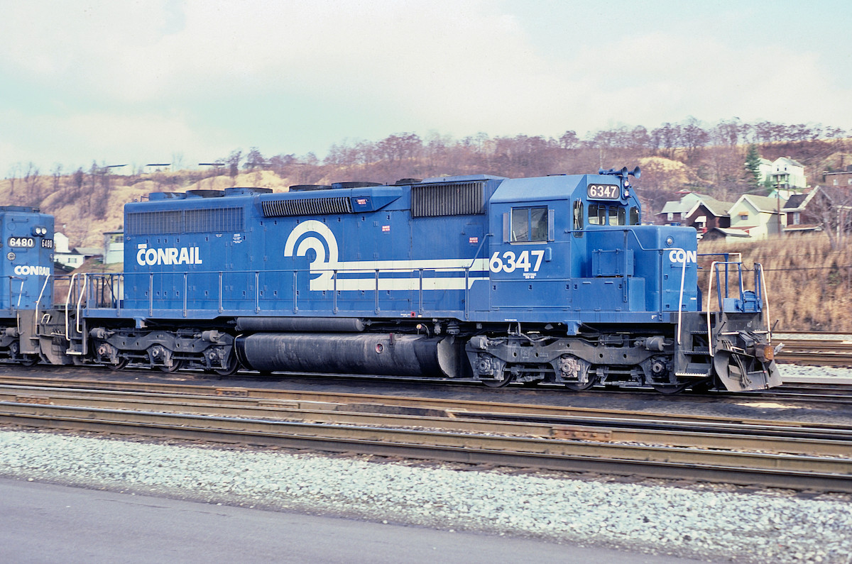 Former Penn Central 6071 was built in 1966 for the Pennsylvania Railroad and eventually retired in 1994 as CR 6324. Note the Penn Central yellow safety paint showing through on the handrails. Often, Conrail didn't strip the predecessor's paint off the locos prior to repainting them blue.